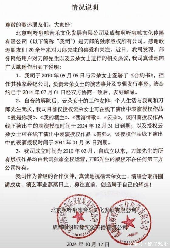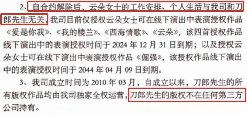 第三条就更明显了,特意强调刀郎的版权不在任何第三方公司持有,还是在云朵开演唱会的前两天发的这个声明。