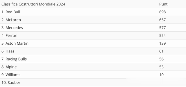 在车队积分榜方面,红牛以698分成功卫冕车队冠军,迈凯伦仅以41分之差屈居亚军,第三名是梅赛德斯的577分,而法拉利则以554分只能获得第四,哈斯车队成为中小车队的领军车队位居第六,而奥迪索伯整个赛季仅仅只获得两个积分位居车队积分榜的最后一名。