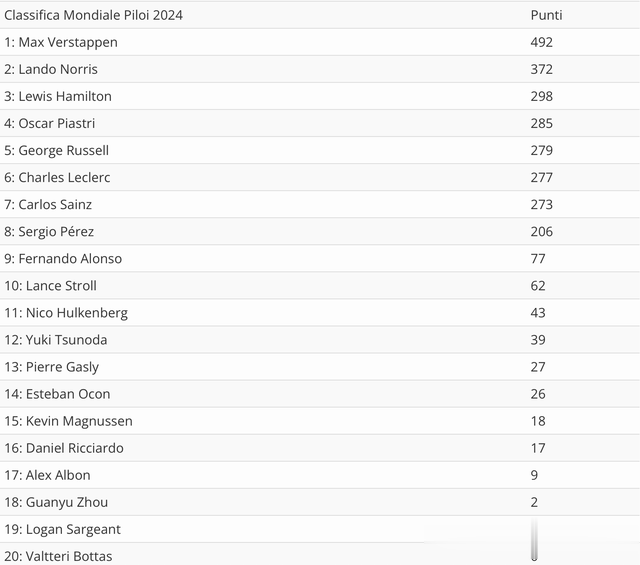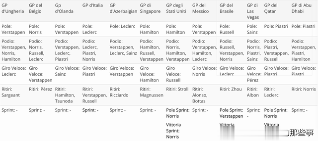 第二,在剩下的12场比赛中,维斯塔潘依然拿下了5场比赛的胜利,其他车手方面,诺里斯拿到了三场胜利,队友皮亚斯特里也有一场胜利收入囊中,而汉密尔顿和拉塞尔分别获得了1场胜利,法拉利的勒克莱尔只为意大利车队带来了一场胜利。